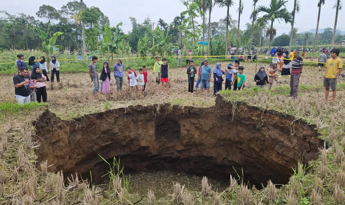 iNews Bukittinggi – Warga Nagari Situjuah Batua, Kecamatan Situjuah Limo Nagari, Kabupaten Lima Puluh Kota, dikejutkan oleh dentuman keras yang disusul amblesnya area persawahan milik warga. Peristiwa tersebut menyebabkan munculnya lubang besar dengan diameter sekitar 20 meter, sehingga menimbulkan kekhawatiran akan potensi bahaya lanjutan di sekitar lokasi.
